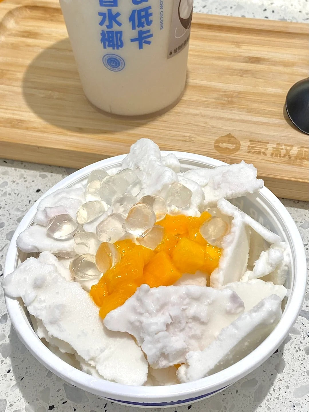 入口濃郁奶香 帶有椰子脆片 , 炒冰下面一片片的冰澆上黑芝士醬,酸甜中帶了一股淡淡的奶香